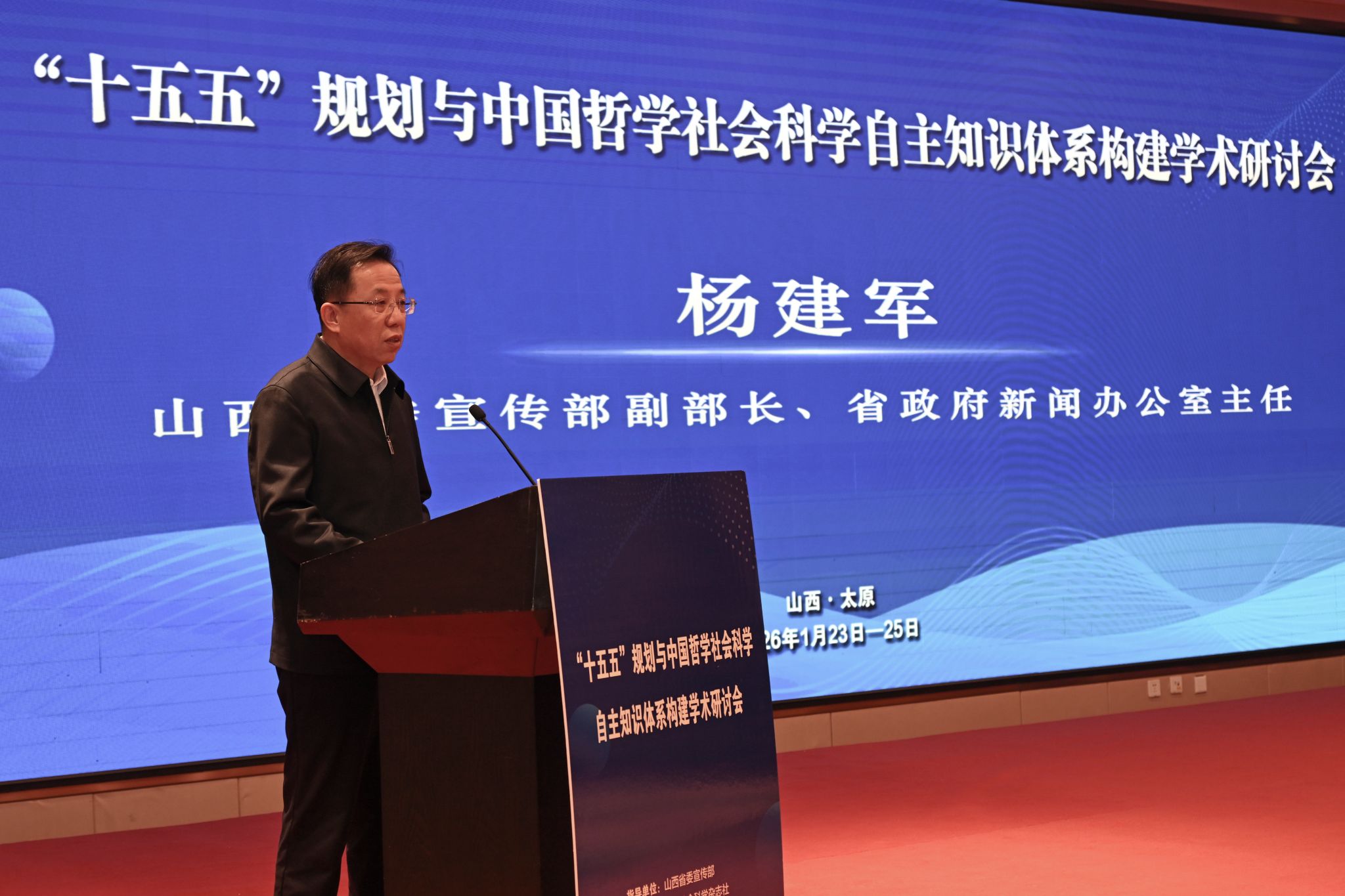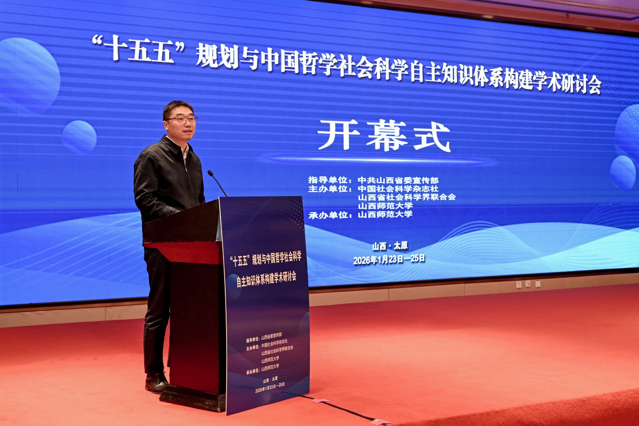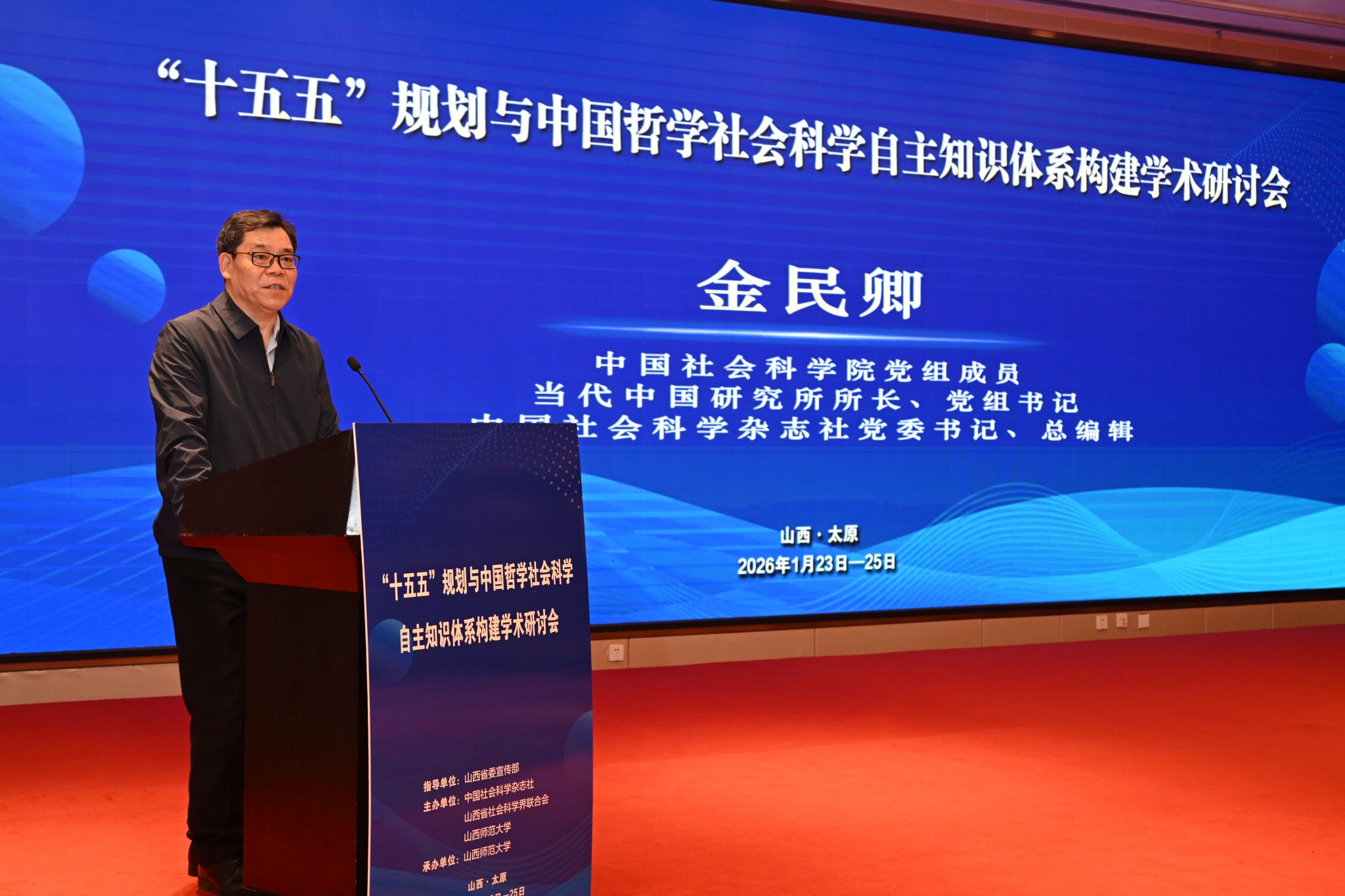 1月24日,由中国社会科学杂志社、山西省社会科学界联合会和我校共同主办的“十五五”规划与中国哲学社会科学自主知识体系构建学术研讨会在太原举行。中国社会科学院党组成员、当代中国研究所所长、党组书记,中国社会科学杂志社党委书记、总编辑金民卿,山西省政协党组成员、副主席王蕾,山西省委宣传部副部长、省政府新闻办公室主任杨建军,山西省社科联党组书记、常务副主席雷承锋,我校党委书记殷杰出席开幕式并致辞。我校校长许小红出席开幕式。开幕式由中国社会科学杂志社党委副书记、副总编辑翟国强主持。