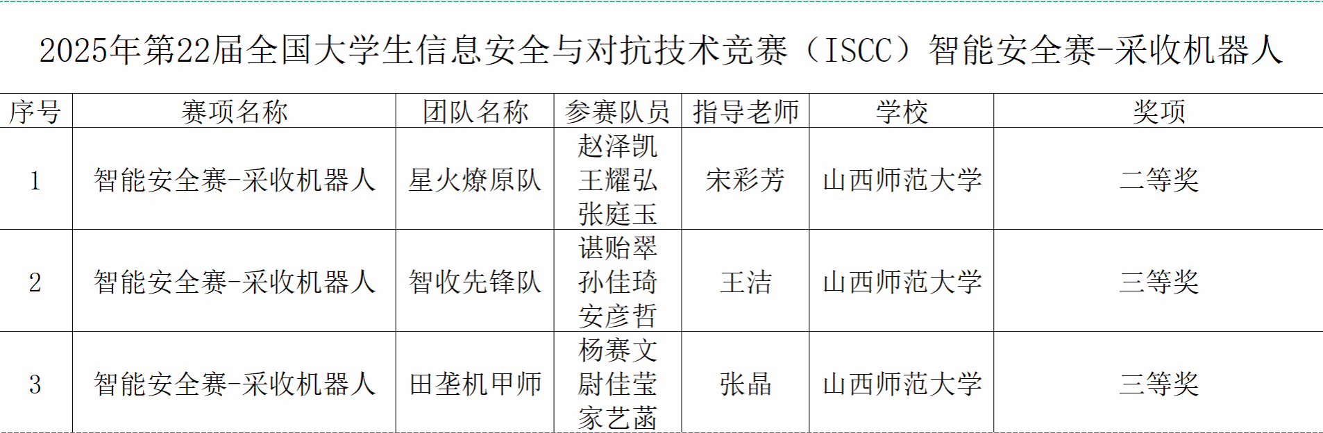 10月24日至26日,2025年第22届全国大学生信息安全与对抗技术竞赛(ISCC)“智能安全赛”全国总决赛在西南林业大学落幕。我校计算机科学与人工智能学院学子在“农业机器人信息安全与对抗”赛道的“智能安全赛 - 采收机器人”赛项中,斩获全国二等奖1项、三等奖2项。