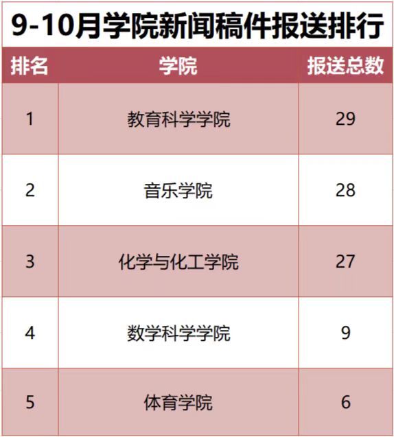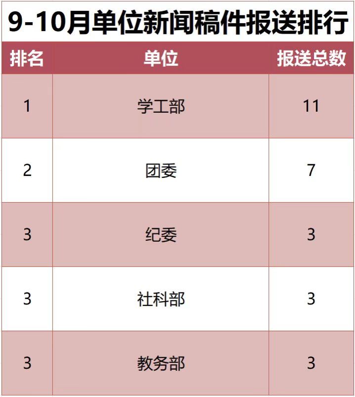 为进一步加强学校新闻宣传工作,学校完善了新闻宣传稿件报送机制,现将2025年9-10月新闻宣传稿件报送排行予以公布。(数据统计截止时间:2025年10月31日)