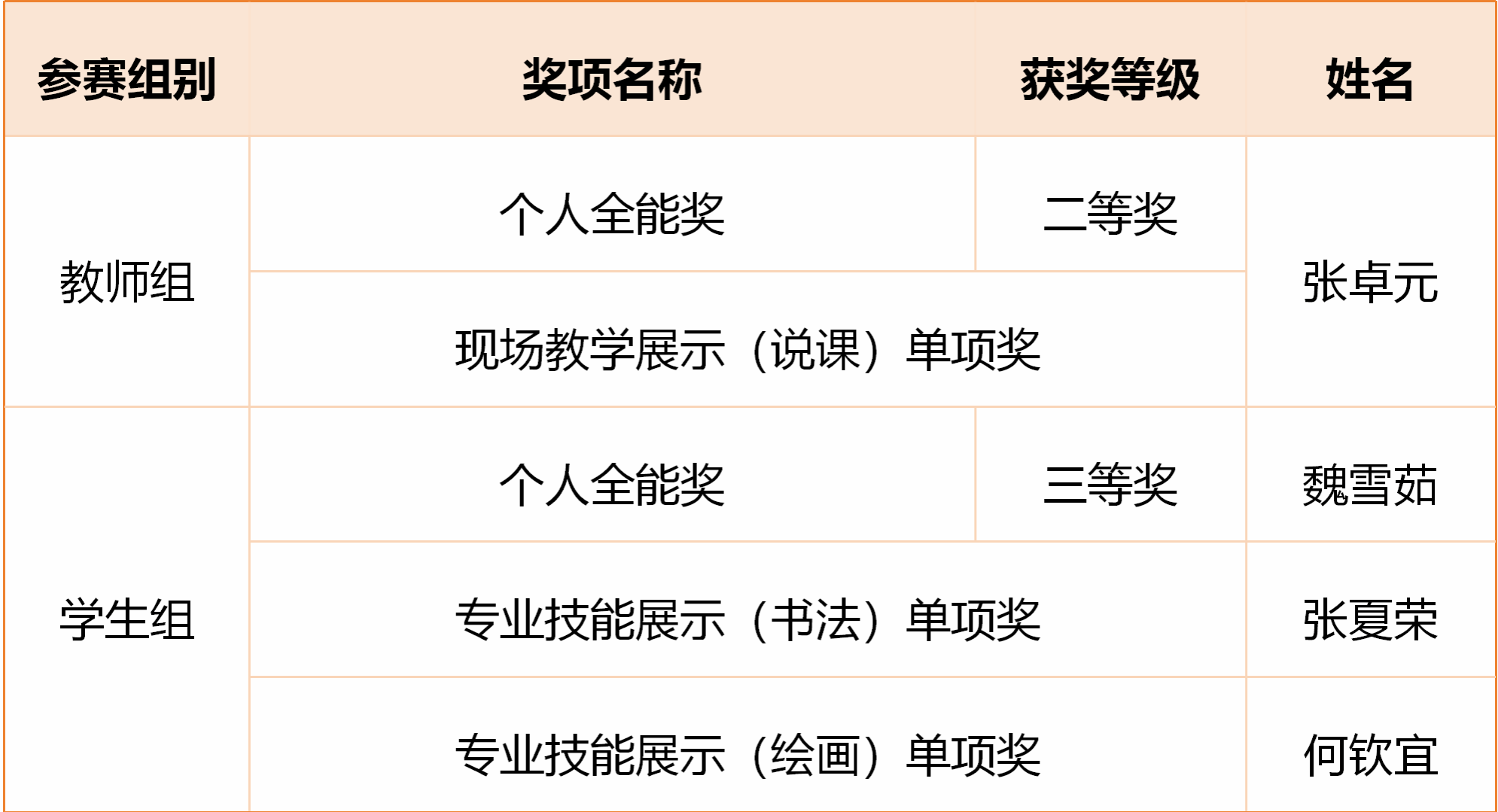 11月14日至17日,全国普通高等学校美术教育专业本科学生基本功展示在广州美术学院举行。我校美术学院张卓元荣获教师组“个人全能二等奖”和“现场教学展示(说课)单项奖”,2022级美术学专业魏雪茹、张夏荣、何钦宜分别获得学生组“个人全能三等奖”“专业技能展示(书法)单项奖”“专业技能展示(绘画)单项奖”。