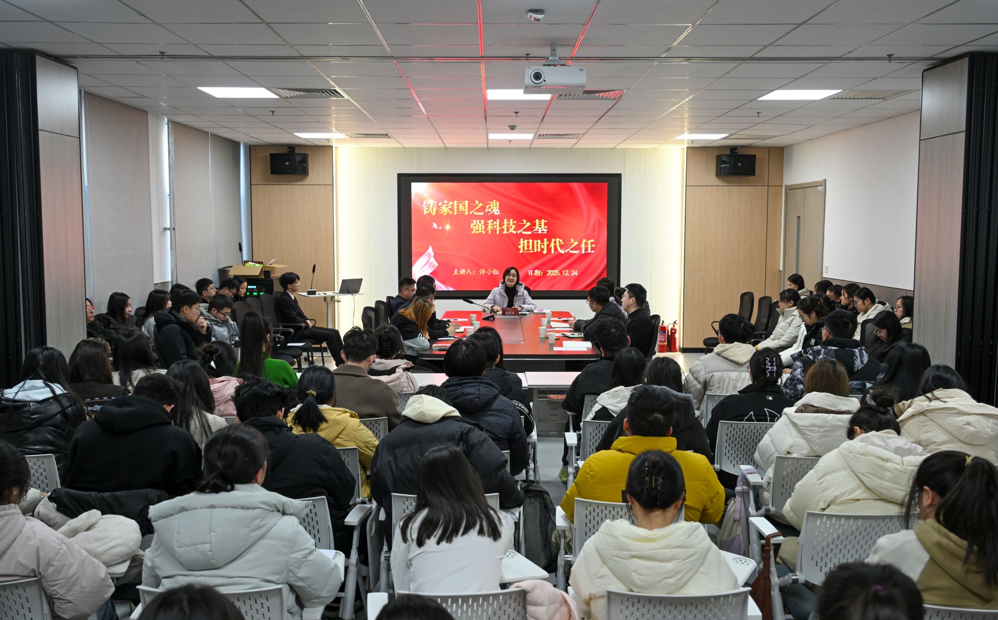12月24日下午,校长许小红讲授深入学习贯彻党的二十届四中全会精神专题思政课。材料科学与工程学院部分师生现场聆听。