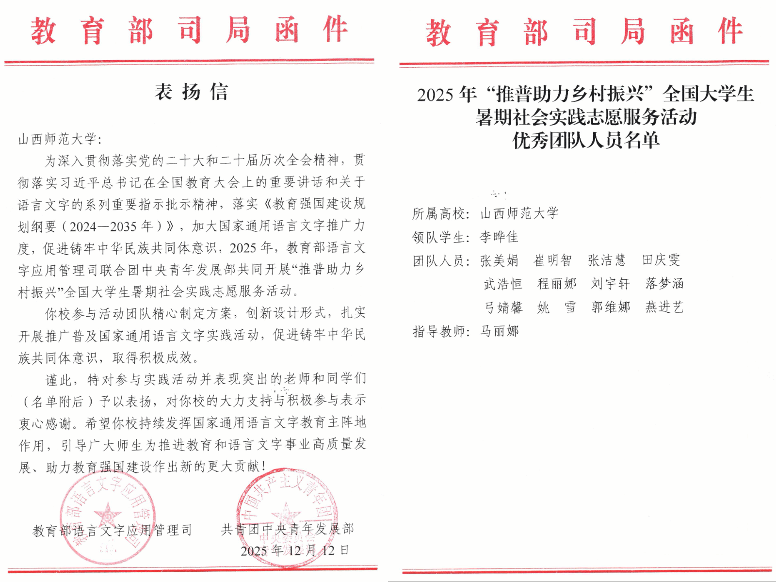 近日,由教育部语言文字应用管理司、共青团中央青年发展部共同主办的2025年“推普助力乡村振兴”全国大学生暑期社会实践志愿服务活动评优结果揭晓。我校物理与电子工程学院236普语飞扬实践队从1000支全国重点团队和1000支参与协同团队中脱颖而出,获评“全国优秀团队”。教育部语言文字应用管理司和团中央青年发展部向我校致表扬信,充分肯定我校青年学子在推广普及国家通用语言文字、服务乡村振兴中的积极作为与实践成效。