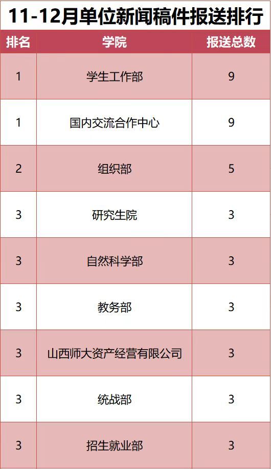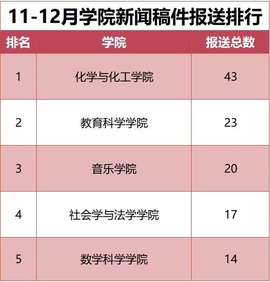 为进一步加强学校新闻宣传工作,学校完善了新闻宣传稿件报送机制,现将2025年11-12月新闻宣传稿件报送排行予以公布。(数据统计截止时间:2025年12月31日)