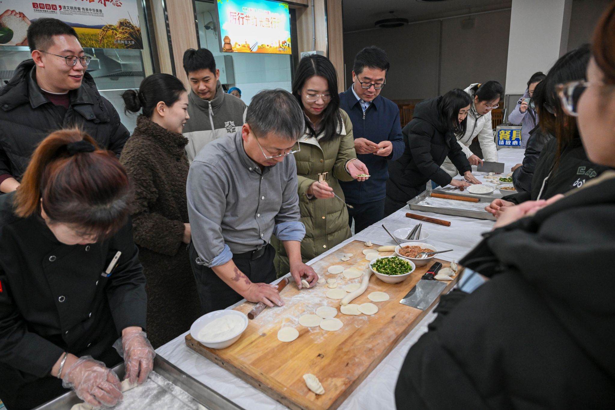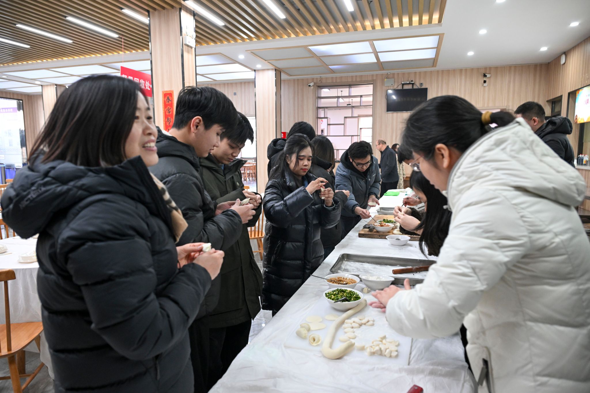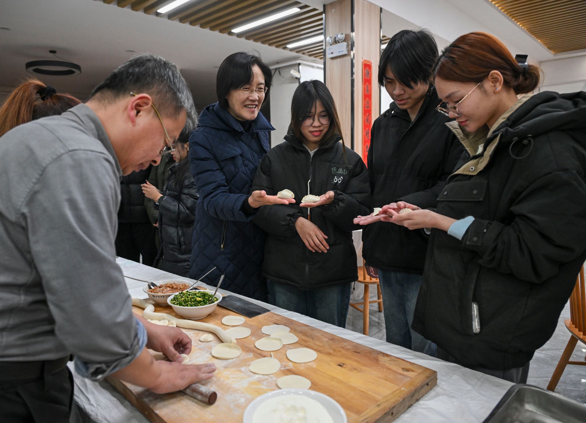 “老师,提前给您拜年啦!”“祝同学们马年进步、万事顺遂!”中午时分,教工餐厅内暖意融融,校领导与留校师生欢聚一堂,大家一起包饺子、聊家常、迎新春,欢声笑语间流淌着浓浓的团圆气息与新春暖意。