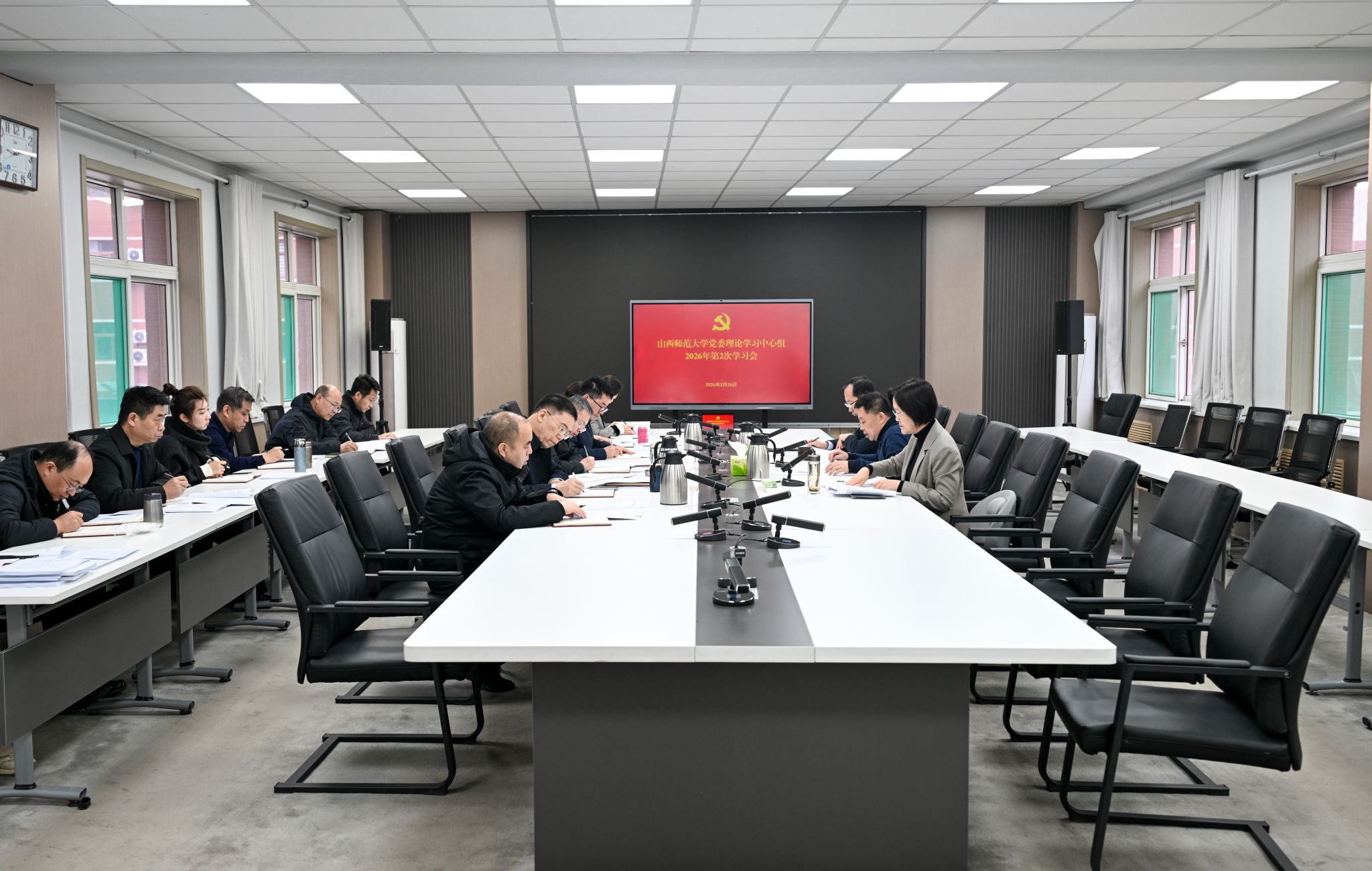 2月26日上午,校党委理论学习中心组召开2026年度第2次学习会,全体在校校领导及中心组成员参加会议。会议由校党委书记殷杰主持。