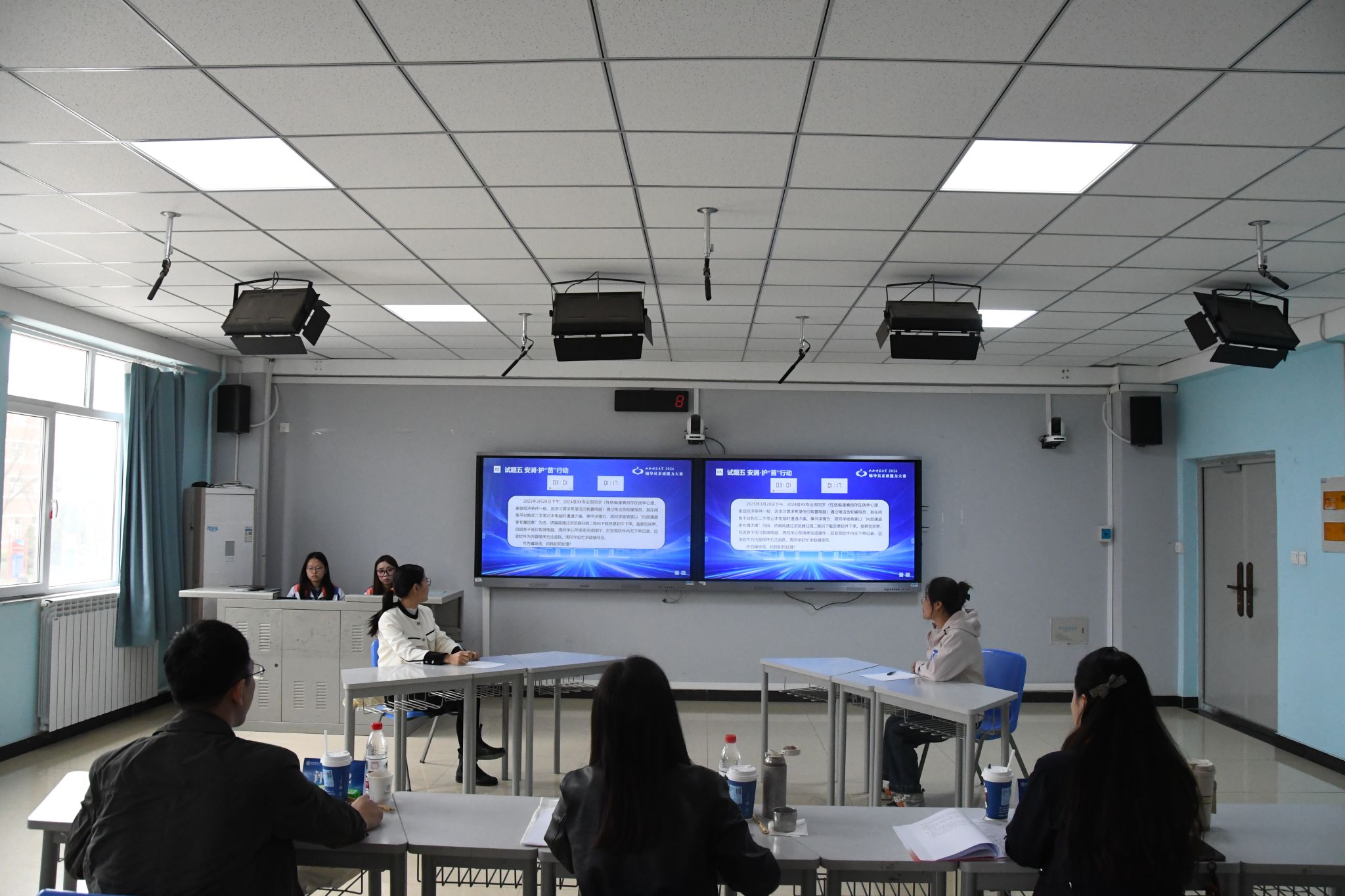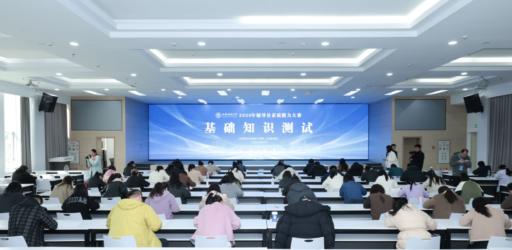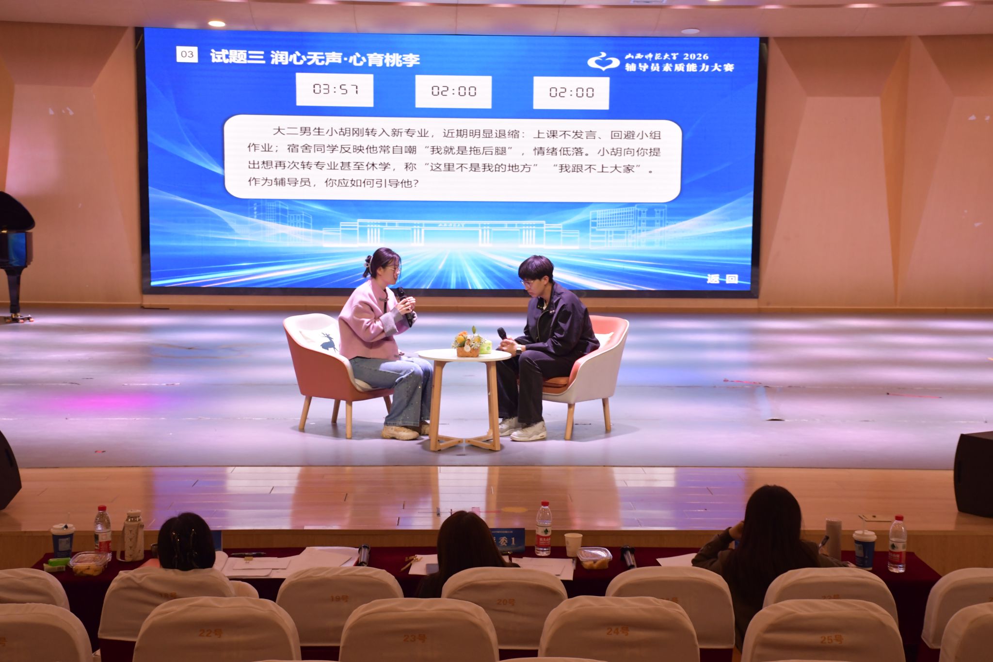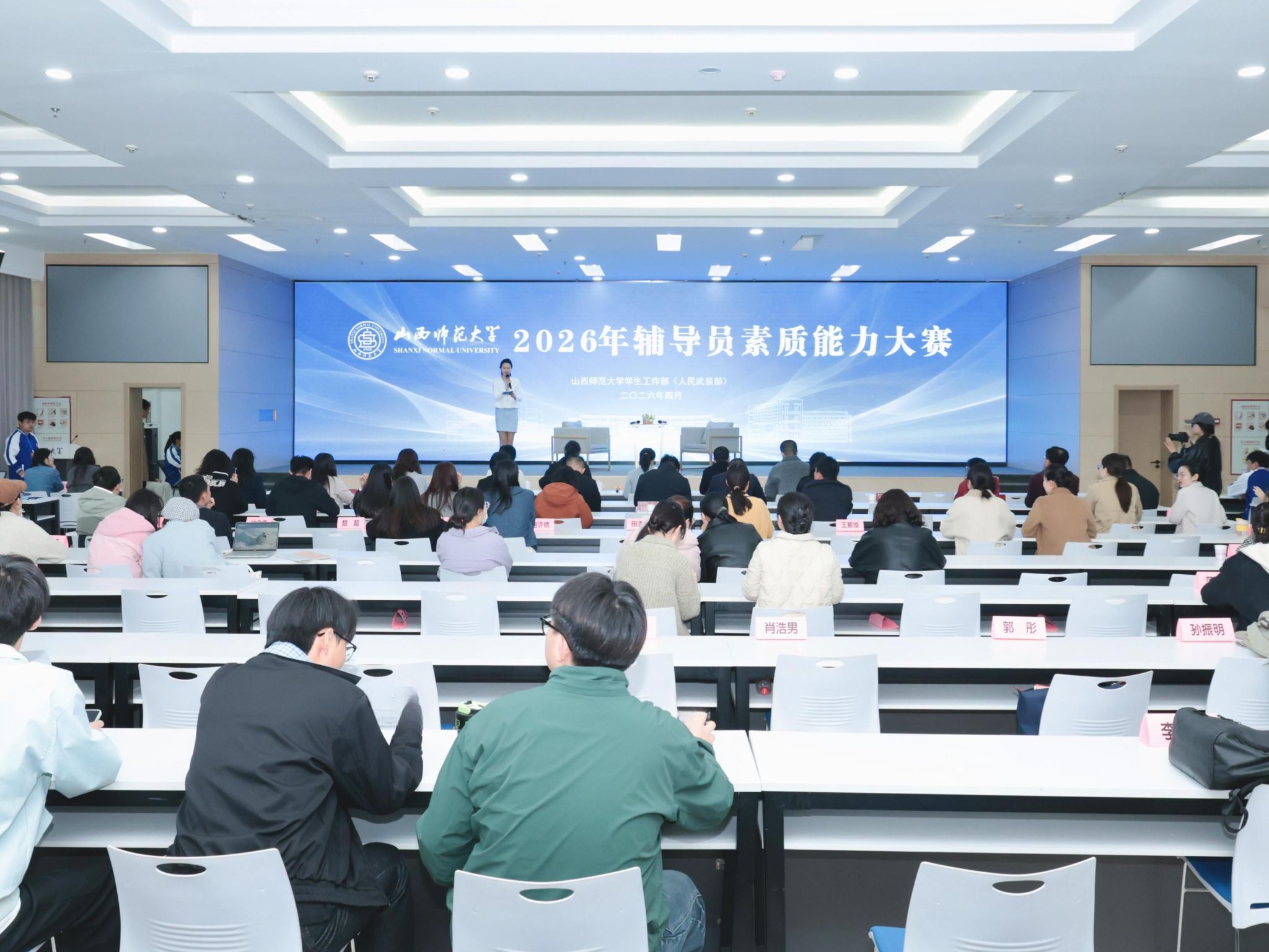 各学院学工组长、团委书记、全体专职辅导员,学生工作部全体人员,以及学生代表在大赛现场观摩。(程圆欣 翟宇霞 褚嘉悦 燕进艺 韩依卓/摄)